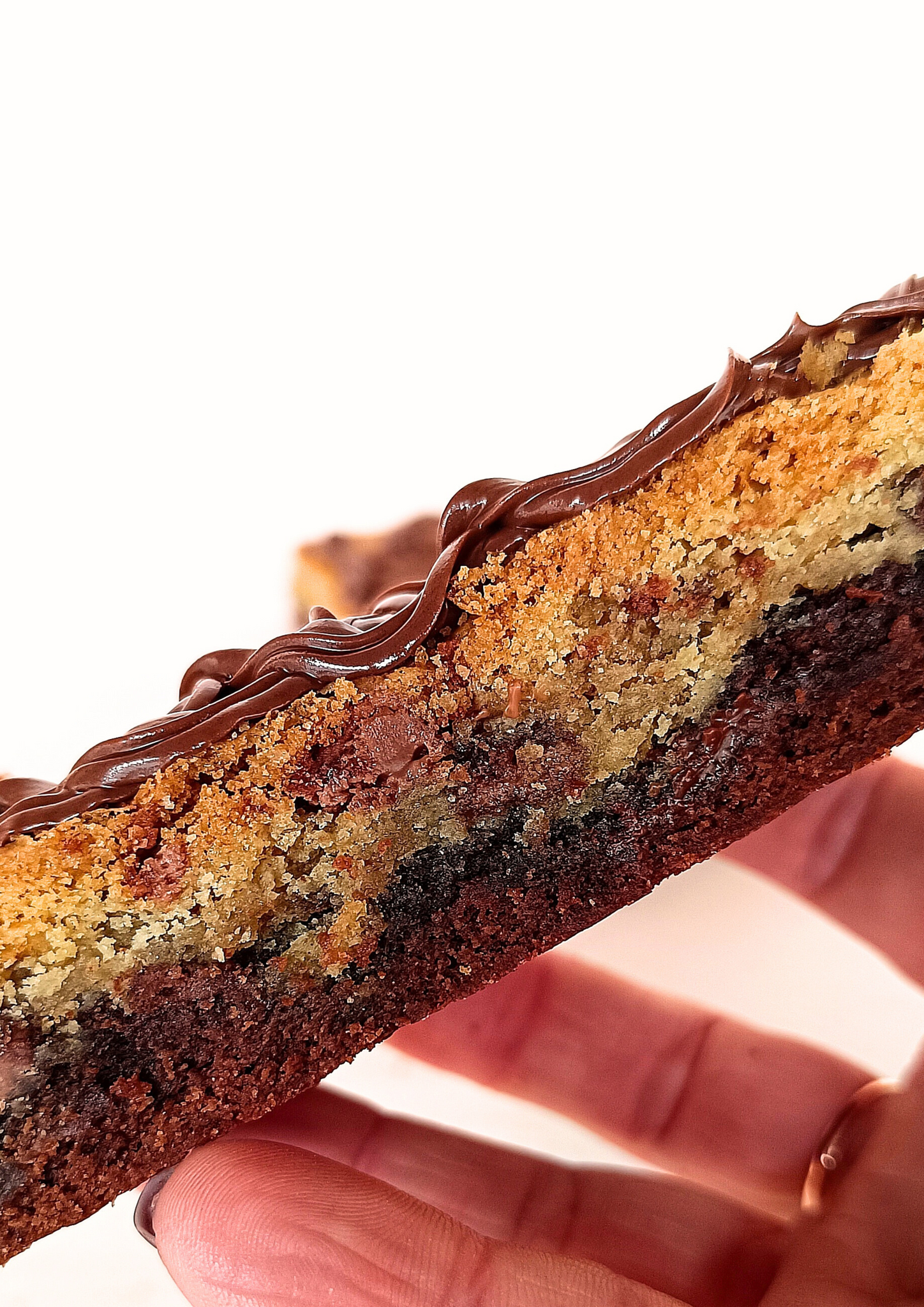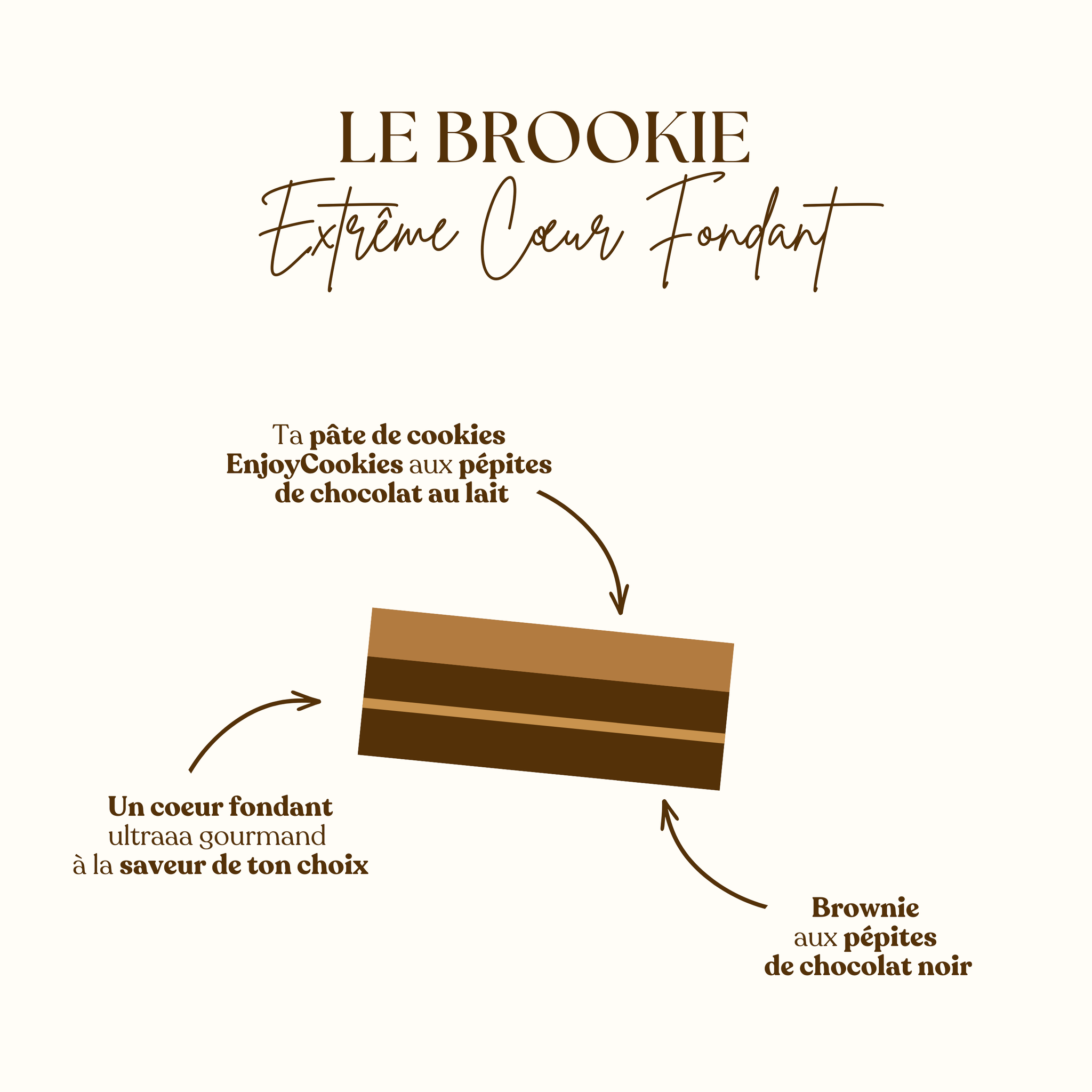 Vous connaissez le brookie soft ? Une base de brownie fondant aux pépites de chocolat noir, surmontée de notre pâte à cookie ultra gourmande aux pépites de chocolat au lait.